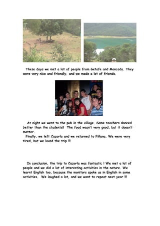 The document summarizes a school trip taken by students from Getafe and Moncada to Cazorla for a bilingual project. They visited sites around Ubeda and Cazorla, engaging in various outdoor activities like canoeing, climbing, and hiking. While the food was unimpressive, the students had an enjoyable time socializing with each other and their guides, making new friends and practicing English along the way. In conclusion, the trip was deemed a fun and successful learning experience that the students hope to repeat in the future.