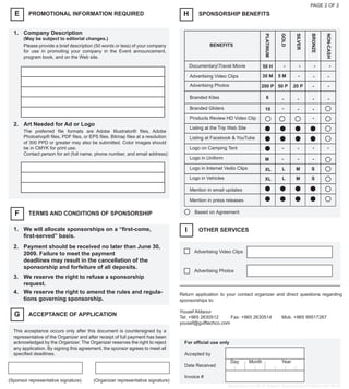 This document is a sponsorship application form for the Aldaour Adventure Trip 2009 in Jordan. It outlines the various sponsorship levels from Platinum to Bronze, ranging in cost from $550,000 to $2,000. Benefits of sponsorship include promotional placement in documentaries, videos, photos, and branding. The application requests contact and organization details, payment and cancellation terms, and promotional materials from sponsors. It must be completed and payment received by June 30, 2009 to receive sponsorship benefits and inclusion in promotional activities for the trip.