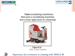 The document is a sales presentation for the Tripla 85B ride-on scrubber drier. It provides the technical specifications of the Tripla 85B, including its high productivity rate of 5100 square meters per hour, large 850mm scrubbing width, and 24/225 volt 225 amp hour battery for all-day cleaning. The presentation touts that the Tripla 85B will revolutionize cleaning.