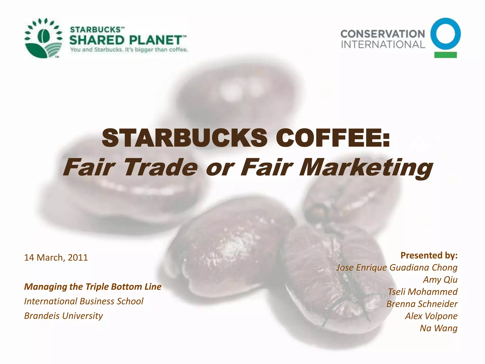 Starbucks has undertaken various corporate social responsibility efforts related to ethical sourcing of coffee, environmental sustainability, and community engagement. However, some argue these efforts are more for marketing purposes than reality. Starbucks works with Conservation International to source coffee sustainably and has goals to increase purchases of certified coffee. It aims to reduce environmental impacts through recycling programs and reducing energy/water use. Starbucks also supports communities through volunteer hours and charitable foundations. Critics note Starbucks recycles only a small percentage of cups and volunteer hours have declined, suggesting CSR efforts may be overstated for marketing purposes.