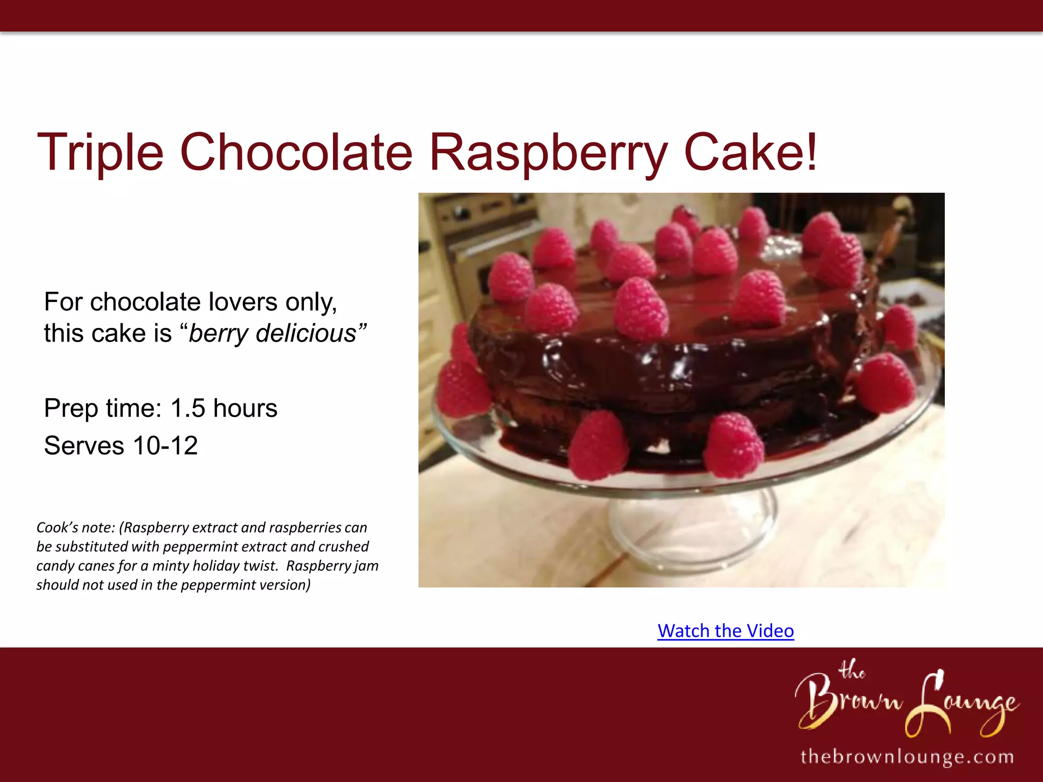 This recipe provides instructions for a triple chocolate raspberry cake with three layers - a chocolate cake, a chocolate raspberry filling, and a chocolate glaze. The cake requires over 1.5 hours of preparation and bakes for about 55 minutes. It serves 10-12 people and contains chocolate, butter, eggs, flour, cocoa powder, raspberry jam, extract and fresh raspberries. Optional substitutions like peppermint extract and candy canes are suggested for a holiday variation.