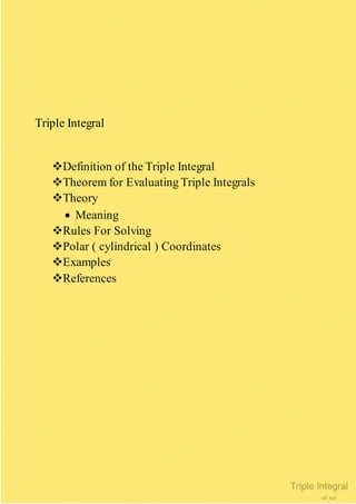 The document defines and provides theory on triple integrals. It discusses that triple integrals are used to calculate volumes or integrate over a fourth dimension based on three other dimensions. Examples are provided on setting up and evaluating triple integrals in rectangular, cylindrical, and polar coordinates. Specific steps are outlined for solving triple integrals over different shapes and order of integration.