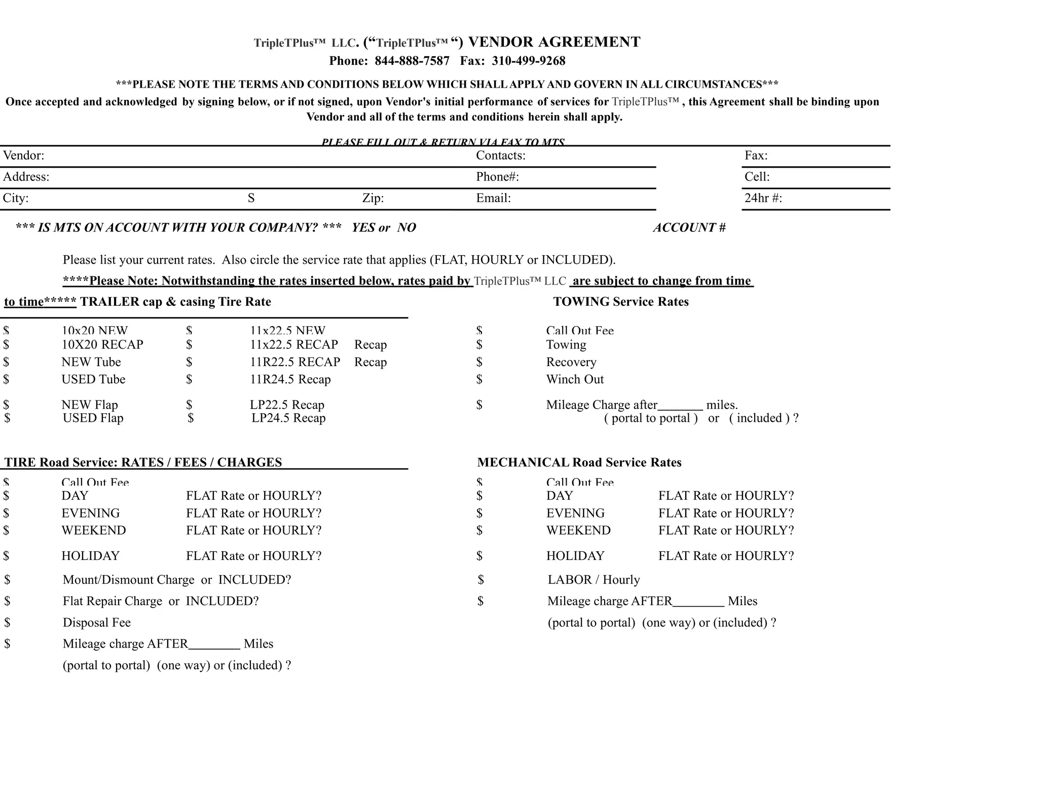 This document is a vendor agreement between TripleTPlus LLC and a vendor. It contains terms and conditions that will govern the business relationship between the two parties. The vendor agrees to indemnify and hold TripleTPlus harmless from any claims arising from services provided. The vendor must also maintain insurance and list TripleTPlus as an additional insured. Any disputes will be resolved in court in Malibu County, California. The vendor acknowledges they are an independent contractor. All invoices must be submitted within 3 days of service or may not be paid.