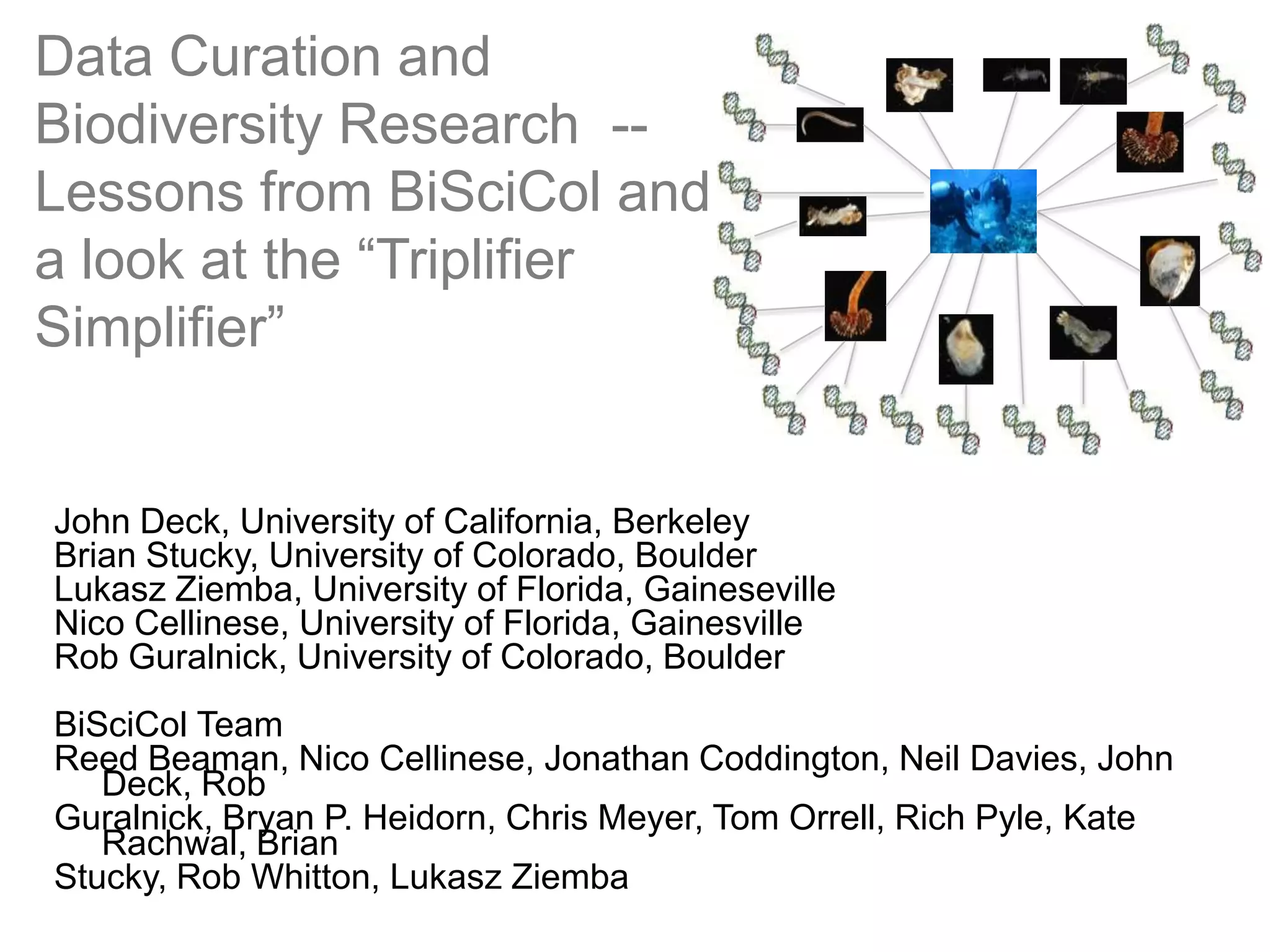 The document discusses the BISCICOL project, a National Science Foundation funded initiative aimed at addressing biodiversity data challenges through the use of linked data and unique identifiers. It outlines the project's infrastructure for tagging and tracking biological specimens, integrating various data types, and promoting community collaboration. Key issues identified include identifier persistence, classification clarity, relation accuracy, and the need for collaborative efforts in the adoption of standards.