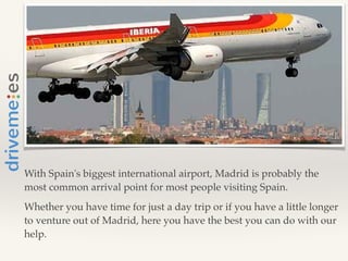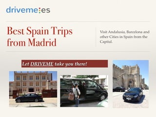 This document provides recommendations for day trips and short trips from Madrid, Spain. It lists several one-day trip destinations within a few hours of Madrid, including Toledo, Segovia, El Escorial, and Aranjuez. It also outlines potential itineraries for slightly longer trips of 2-4 days that allow visitors to explore multiple cities like Salamanca, Cuenca, Burgos, Seville, Cordoba, and Granada. The document encourages using a service called DRIVEME to access over 200 rental vehicles and professional drivers to guide trips from Madrid to other parts of Spain.