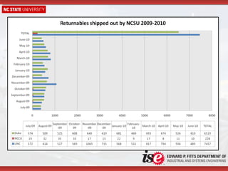 The document analyzes different shipping options for Tripsaver, a service that facilitates sharing of returnable items among libraries in the Triangle Research Library Network. It finds that using a mix of third-party logistics and van services can provide same-day delivery to patrons while reducing costs compared to the current 2-3 day delivery model. Specifically, using UPS for items borrowed by NCSU and continuing van delivery for items requested from other universities could cut total annual costs by 2% and improve the customer experience.