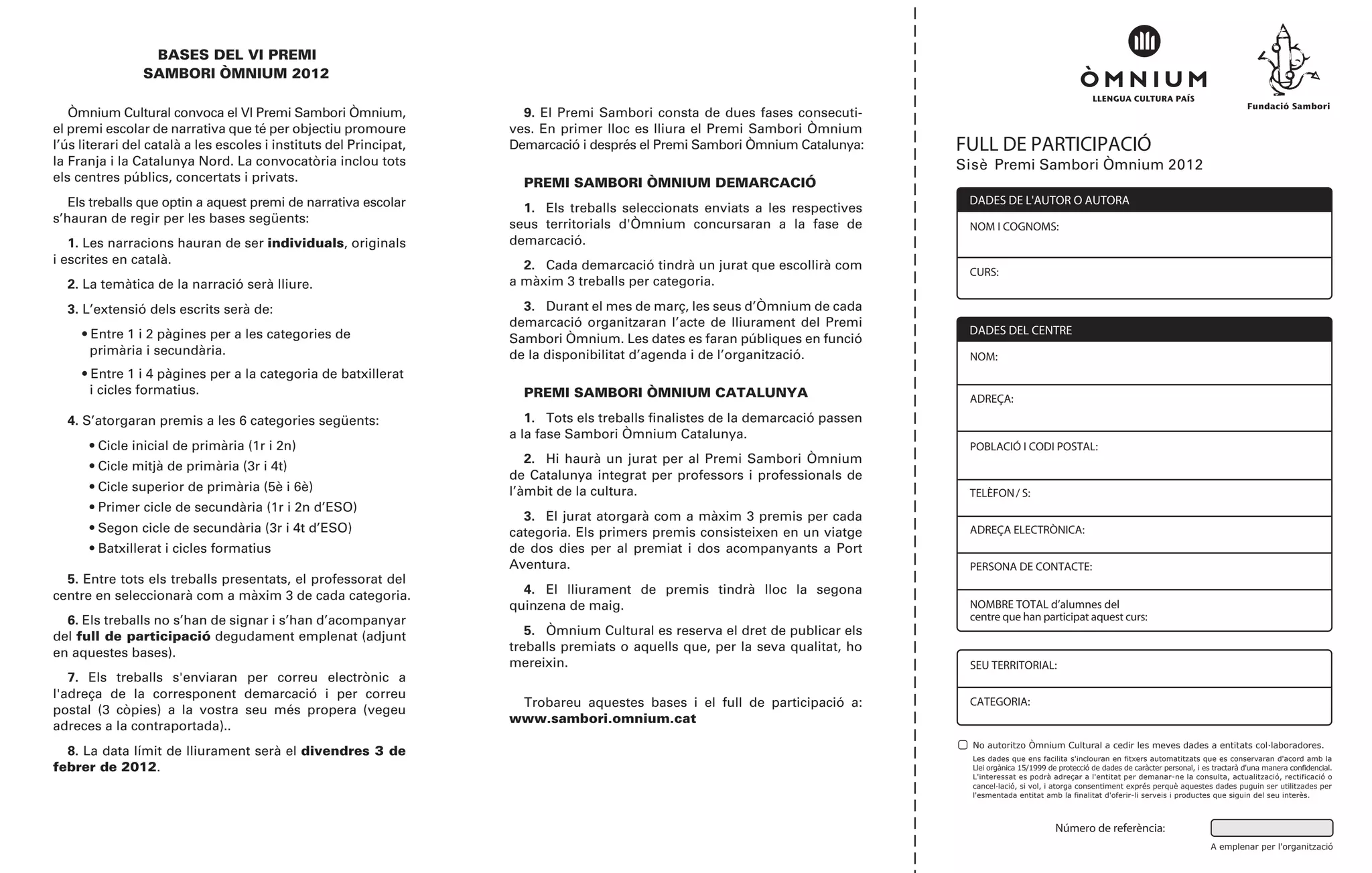 l’ús literari del català a les escoles i instituts del Principat, Demarcació i després el Premi Sambori Òmnium Catalunya: FULL DE PARTICIPACIÓ