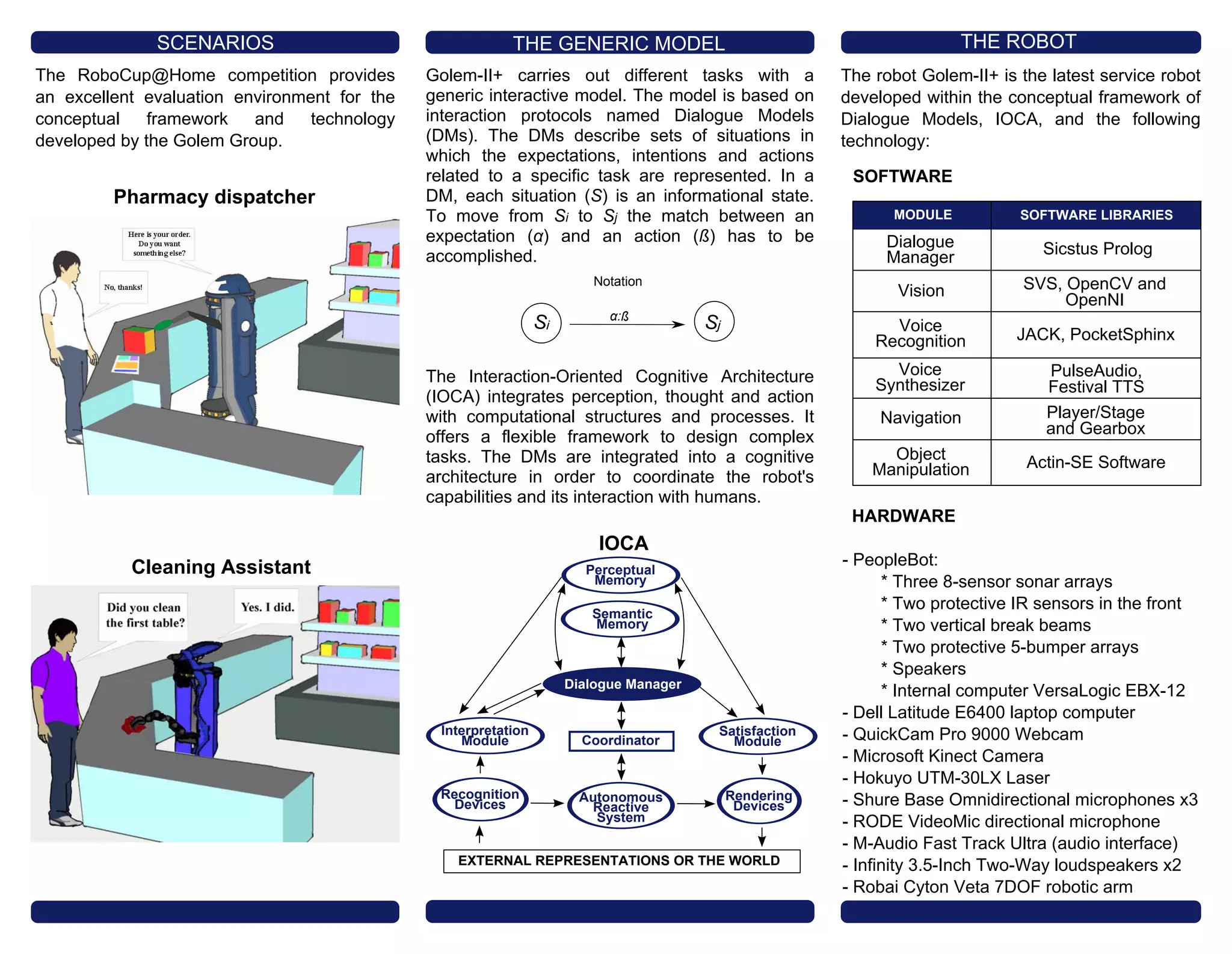 The document describes the golem-ii+, a service robot designed for various tasks using a cognitive architecture called interaction-oriented cognitive architecture (IOCA), which integrates dialogue models to coordinate human-robot interaction. The robot is equipped with multiple sensors and software tools, enabling it to listen to instructions, navigate, recognize objects, and recover from errors during interactions. Developed by the Golem Group, the system aims to provide a flexible and efficient framework for managing robotic behaviors in diverse environments.