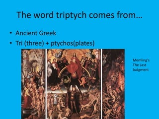 A triptych is a work of art with three panels, usually hinged, with related imagery. The middle panel is often largest. Triptychs were commonly used in medieval and Renaissance Christian artworks. They allowed flexibility for transport and appeared frequently in churches as altarpieces from the Middle Ages onward. Examples include works by Hans Memling featuring The Last Judgment and Hugo van der Goes' Adoration of the Shepherds.