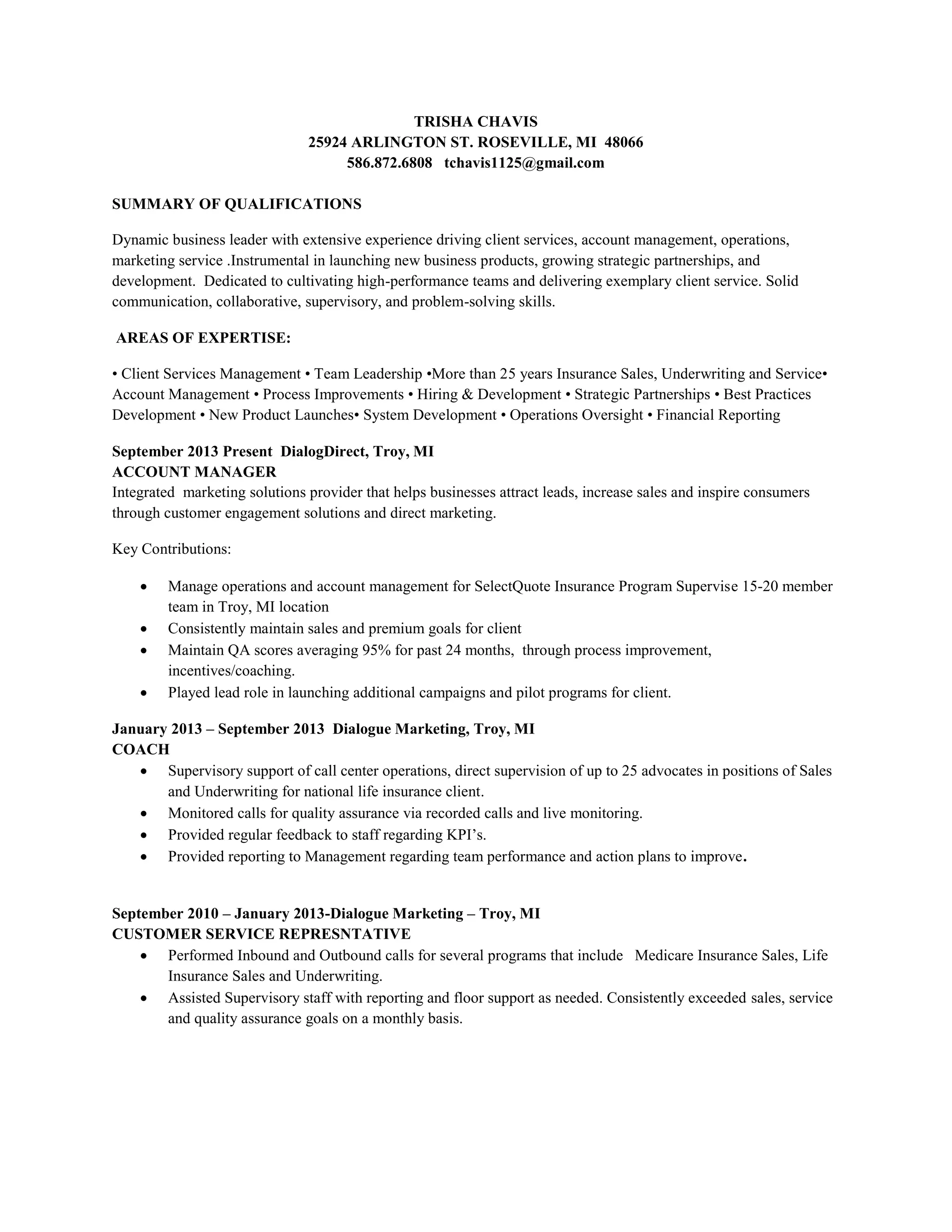 Trisha Chavis has over 25 years of experience in insurance sales, underwriting, client services, account management, and operations. She has a track record of growing strategic partnerships, launching new products, and delivering exemplary client service. Currently she manages operations and a team of 15-20 people as an Account Manager at DialogDirect.