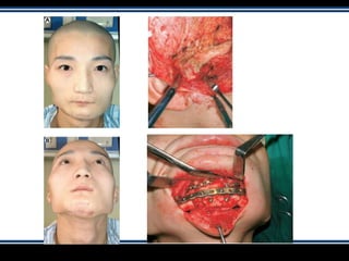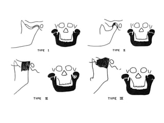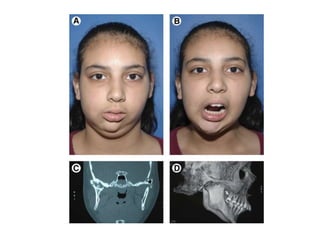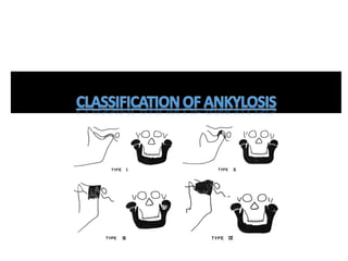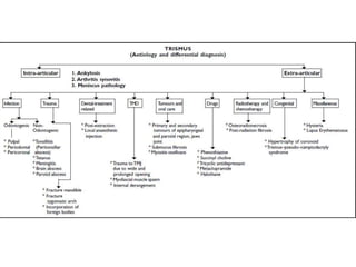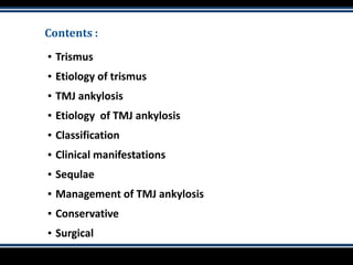 This document provides information on trismus, TMJ ankylosis, their causes and management. It discusses that trismus is the inability to open the mouth, and normal opening is 40-60mm. Trismus can be caused by infections, trauma, dental procedures, tumors, drugs, radiation and congenital issues. TMJ ankylosis is a stiffness of the joint resulting in limited or no mobility. It discusses the classification, clinical manifestations, diagnosis and management of TMJ ankylosis, whether conservative or surgical. The goals of surgical management are to release the ankylosed mass, create a gap for mobility, reconstruct the joint and prevent re-ankylosis.
