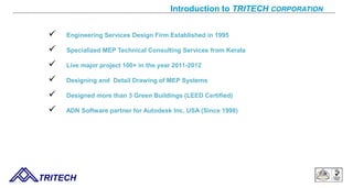 Tritech Corporation is an engineering services design firm established in 1995 in Kerala, India that specializes in MEP technical consulting services. It has designed over 100 projects in 2011-2012, including more than 3 green buildings. The company provides full MEP and engineering design services for various project types including malls and commercial buildings, hospitals, and other large-scale developments. It utilizes Revit MEP modeling and follows various industry standards in its work.