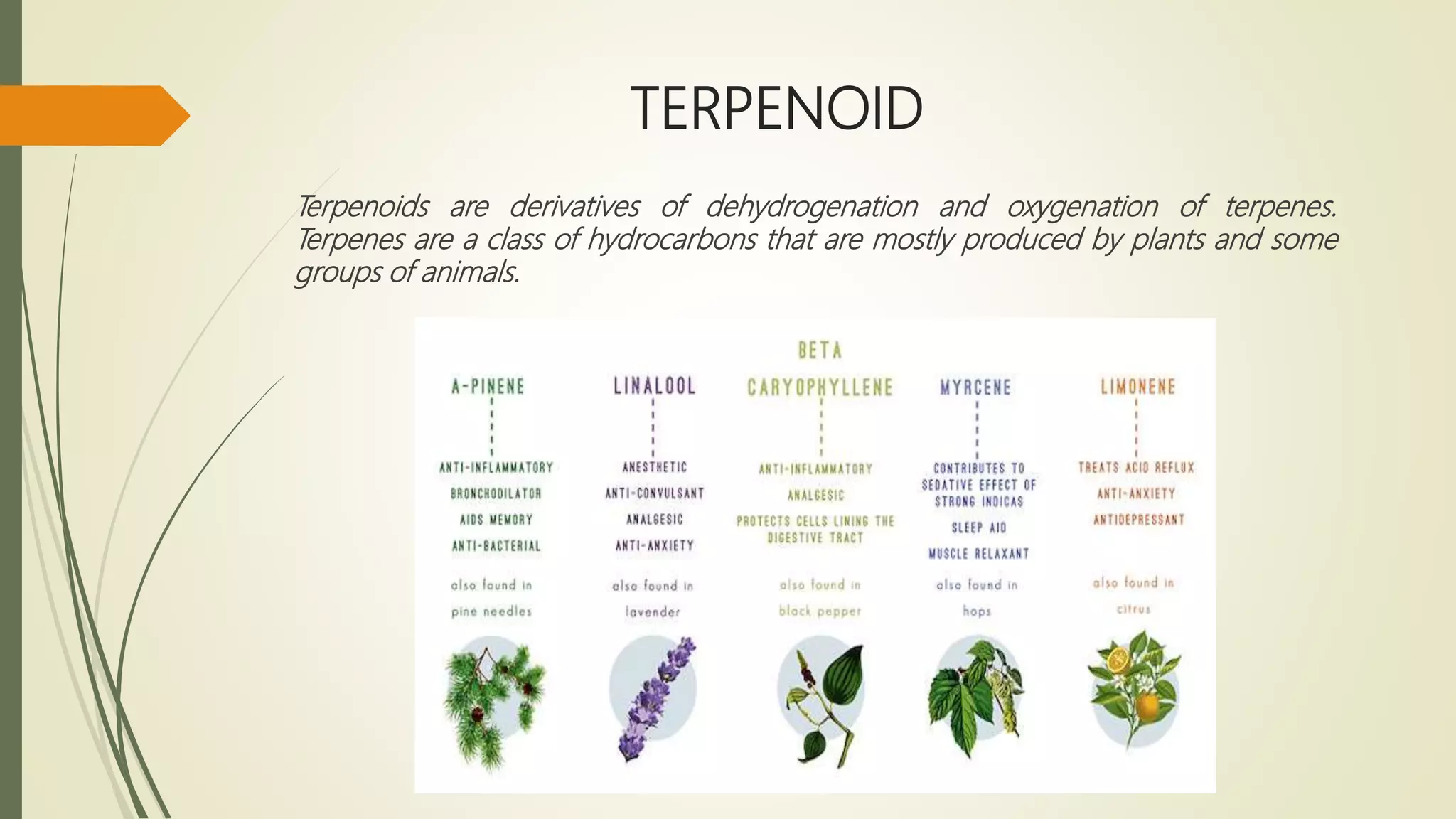 Terpenoids are derived from terpenes through dehydrogenation and oxygenation reactions. They are mostly produced by plants and some animal groups. Triterpenoids can be found freely or as glycosides in plant tissue, with pentacyclic triterpenoids being the most widespread. Tetraterpenes never form large ring structures and include carotenoids like lycopene and beta-carotene. Politerpenes are important polymers like natural rubber, which is thought to function as a carrier in plant biosynthesis.