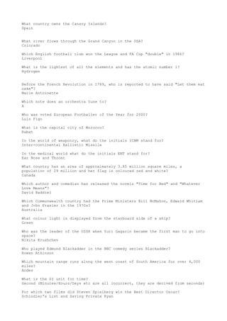 Spain owns the Canary Islands. The Colorado River flows through the Grand Canyon in the USA. Liverpool won the League and FA Cup "double" in 1986. Hydrogen is the lightest element with an atomic number of 1. Marie Antoinette is reported to have said "Let them eat cake" before the French Revolution in 1789. An orchestra tunes to the note A. Luis Figo was voted European Footballer of the Year for 2000. The capital city of Morocco is Rabat. ICBM stands for Inter-continental Ballistic Missile. ENT stands for Ear Nose and Throat in the medical world. Canada has an area of approximately 3.85 million square miles, a