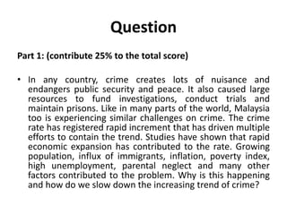 The document discusses a MyTriz competition question about reducing crime rates in Malaysia. It notes that crime rates have been increasing rapidly due to factors like economic expansion, population growth, immigration, poverty, unemployment, and parental neglect. It asks how to slow this trend. The document then outlines how TRIZ design principles could provide potential solutions, such as segmentation (community programs), taking out (undercover operations), local quality (mentoring programs), and prior action (parental influences). Overall, it analyzes the crime problem and proposes applying various TRIZ principles to develop solutions.