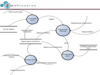 Preservation planning involves defining preservation criteria based on risk analysis of organizational context and digital objects. It follows a systematic process to develop preservation plans by evaluating available strategies against criteria. The goals are to support decision-making, formulate high-quality and cost-effective plans, and enable execution of preservation actions. The Planets approach understands user needs and policies through interviews and develops a decision support tool to select best strategies based on collection profiles and requirements. Plans trigger automated preservation actions and are re-evaluated periodically with technology changes.