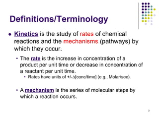 This document discusses chemical kinetics and reaction rates. It defines kinetics as the study of reaction rates and mechanisms. Reaction rates describe how quickly reactions occur, while thermodynamics determines whether reactions can occur. The rate of a reaction is the change in concentration of reactants or products over time. Reaction mechanisms involve the molecular steps of reactions. Rate laws are determined experimentally and describe the dependence of reaction rates on reactant concentrations. Integrated rate laws relate concentration to time for reactions and can be used to determine amounts of reactants or products over time. First-order reactions follow integrated rate laws of ln[A] = -kt or [A] = [A]0e-kt, where k is the rate constant and t is time.