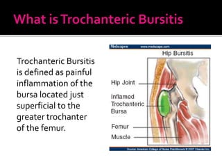 Trochanteric bursitis is inflammation of the bursa near the greater trochanter of the femur that causes lateral hip and thigh pain. It is often due to repetitive trauma from prolonged standing with asymmetric posture, running, or stairs. Symptoms include pain with hip movement and muscle contraction. Treatment focuses on reducing inflammation, restricting aggravating activities, stretching tight muscles, and strengthening weak muscles like the glutes and lateral hip rotators through a progressive exercise program.
