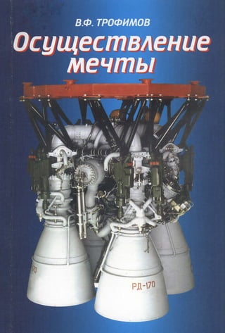 Книга В.Ф. Трофимова 'Осуществление мечты' посвящена жидкостным ракетным двигателям (ЖРД), с акцентом на двигатель РД-170, разработанный НПО Энергомаш. В доступной форме автор излагает концепцию ЖРД, его историю, а также трудности и достижения при создании мощного двигателя. Книга предназначена для широкой аудитории и содержит множество технических деталей, упрощенных для понимания непосвященными читателями.
