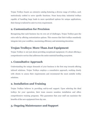 Trojan Trolleys is a leading provider of high-quality material handling equipment designed to streamline operations across various industries. They offer a diverse range of customizable trolleys, a consultative approach, and comprehensive support services, including installation, training, and maintenance. By investing in Trojan Trolleys, businesses can enhance their efficiency and competitiveness in material handling.