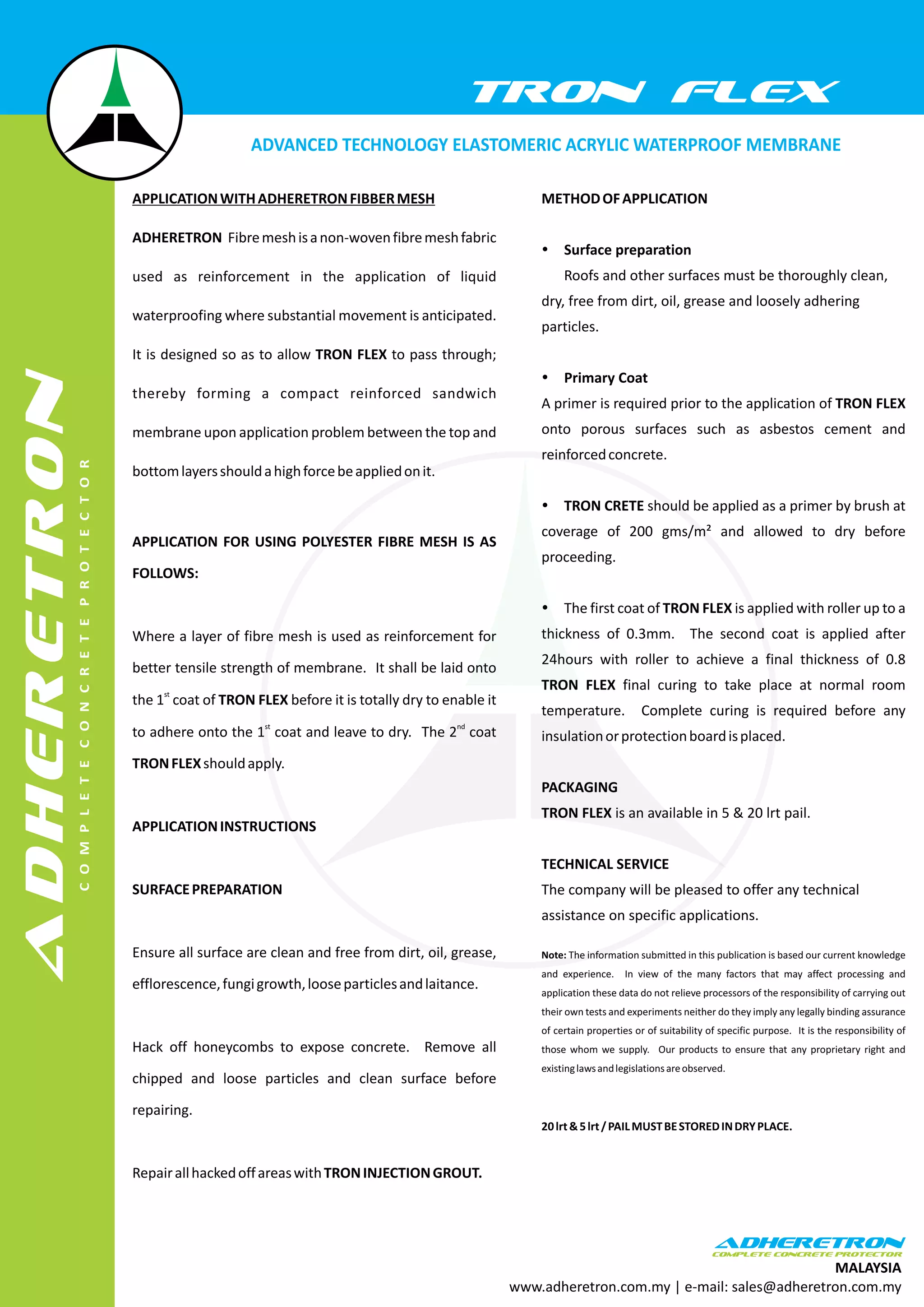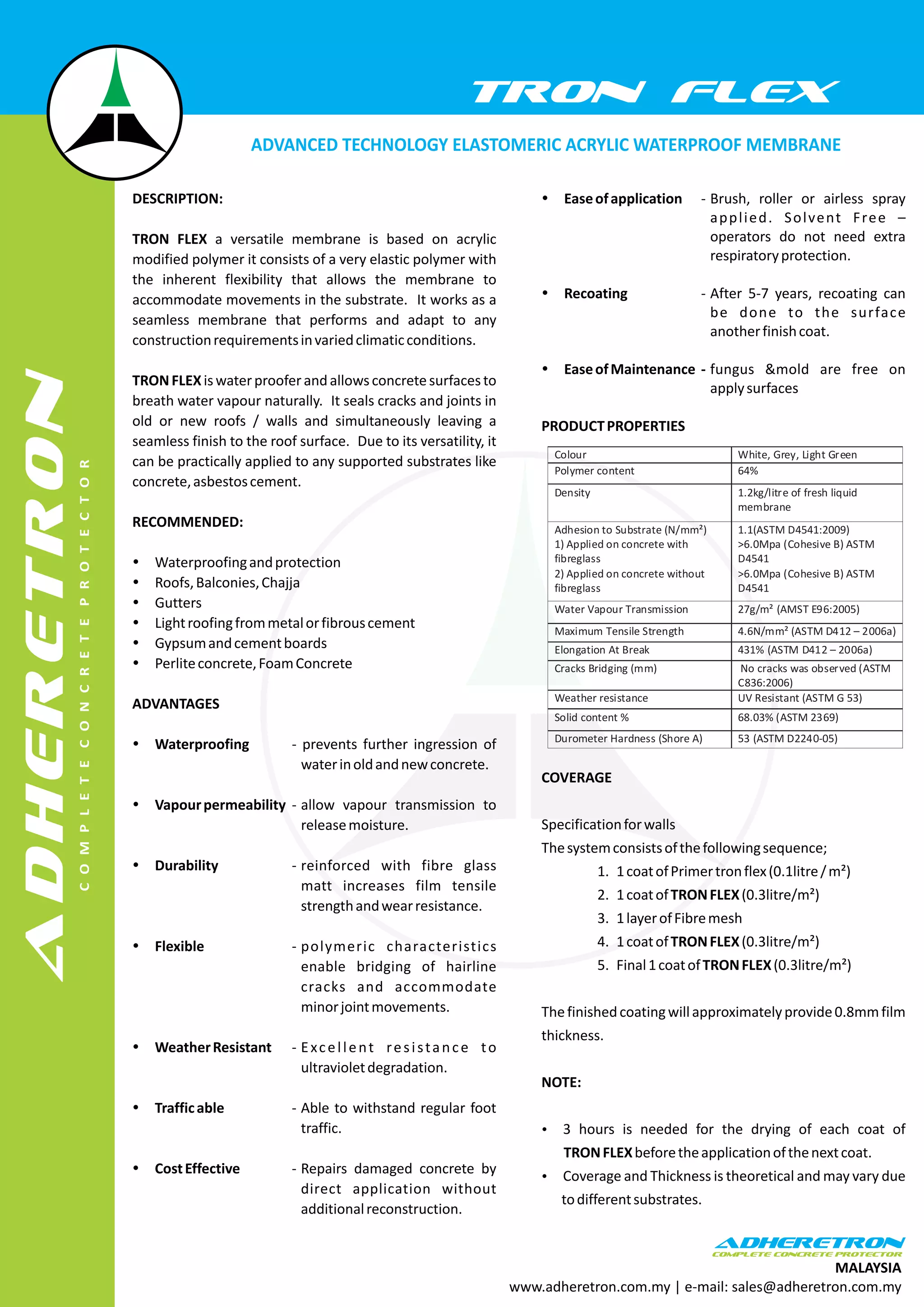 TRON FLEX is an acrylic polymer-based membrane that provides waterproofing and vapor permeability for building surfaces like concrete, asbestos cement, roofs and walls. It is flexible to accommodate substrate movement, seamless, and durable. The membrane is applied in multiple coats, with fiber mesh reinforcement between coats, to form a waterproof and breathable barrier that seals cracks and joints.