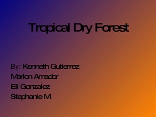 Tropical dry forests are located between 10-20 degrees north and south of the equator, including parts of Africa, South and Central America, Mexico, India, and Australia. They experience high temperatures year-round and long dry seasons with several hundred centimeters of annual rainfall. Trees and plants must be able to survive periods of low moisture by dropping leaves or having thick bark and deep roots. Tropical dry forests support a variety of wildlife like tigers, monkeys, elephants, and birds that have adaptations for long dry seasons.