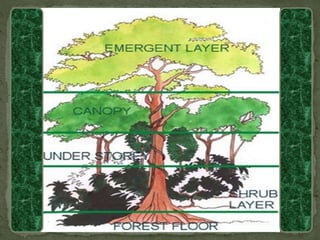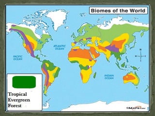 Tropical rainforests are located in hot and wet equatorial regions with heavy rainfall, such as Southeast Asia, Africa, South America, and the Pacific Islands. The vegetation forms a dense canopy with various layers and includes hardwood trees, shrubs, vines, and mosses. These regions experience a hot and humid climate with rainfall throughout the year, supporting the growth of the rich biodiversity found within, including many monkeys, apes, birds, snakes, insects, and large cats.