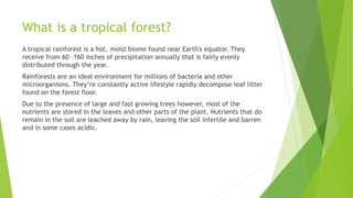 The tropical rain forest can be found in three major geographical areas around the world. It has four distinct layers - emergent, upper canopy, understory, and forest floor. There are several types of rainforests defined by location and climate factors. Rainforests have a warm, humid climate with high rainfall. They provide many benefits but are threatened by habitat loss, climate change, and other environmental impacts. Conservation efforts include programs like REDD that use carbon credits to incentivize forest protection.