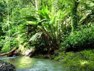 Tropical rainforests are located along the equator where temperatures and humidity are high. They receive between 4-8 meters of rain per year. The largest rainforests are found in Central and South America, Southeast Asia, and West Africa. Tropical rainforests are at risk of destruction due to human activity, with over half of the original forests already destroyed. The biodiversity of these forests is high, containing many species of plants and animals, some of which may provide cures for human diseases.