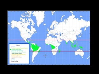 Tropical rainforests exist within 28 degrees of the equator, receiving high rainfall annually between 50-260 inches. They cover less than 6% of the Earth's land but are home to over 50% of all animals and plants, and produce 40% of the planet's oxygen. Within a single hectare of rainforest there can be over 42,000 insect species and 1,500 plant species. Major rainforest types include lowland equatorial evergreen, moist deciduous seasonal, montane, and flooded forests. The layers of a rainforest are the forest floor, understory, canopy, and emergent layer, with different environmental conditions and species in each level.