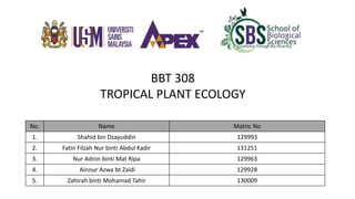 The document discusses the tropical rainforest biome and the impacts of climate change. It defines tropical rainforests as having very high rainfall, high temperatures, and high biodiversity. Tropical rainforests play an important role in regulating the global climate through carbon storage, oxygen production, and influencing weather patterns. Climate change poses threats to tropical rainforests like rising sea levels which can flood coastal forests, and droughts which make forests more vulnerable to fires. The loss of tropical rainforests exacerbates climate change due to reduced carbon storage capacity.