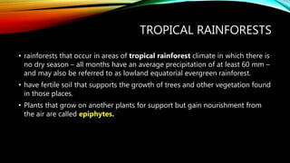 Tropical rainforests are located near the equator and have hot, moist climates with no dry season. They have several layers of vegetation including emergent trees that can reach heights of 72 meters, an upper canopy of smaller trees, and an understory of shrubs and vines. These forests support a high level of biodiversity and many species interact and depend on each other for survival. However, human activities like deforestation and pollution are reducing tropical rainforest habitats and negatively impacting the balance of these ecosystems. Conservation efforts aim to protect remaining rainforests and restore damaged areas to preserve biodiversity and ecosystem services.