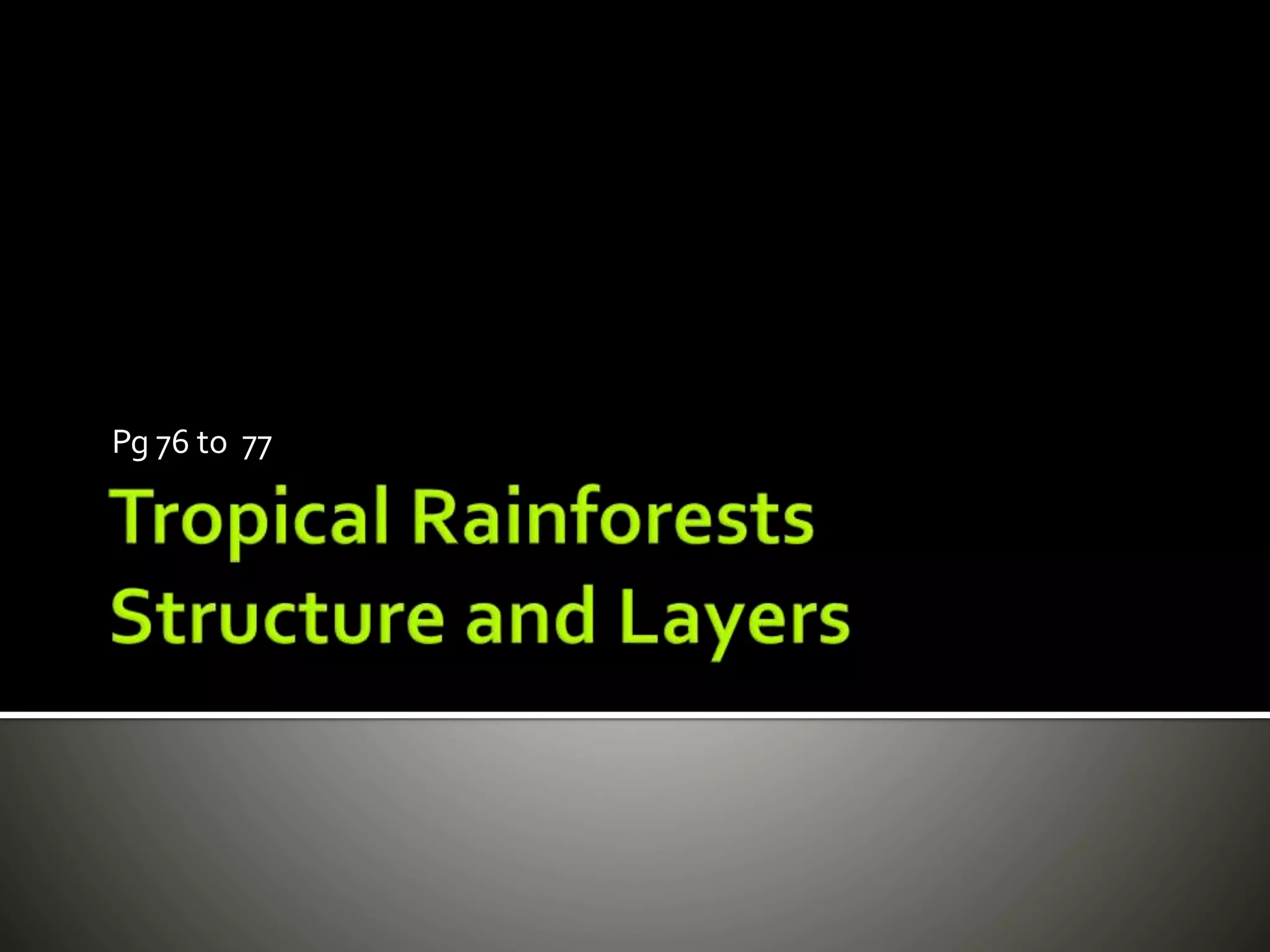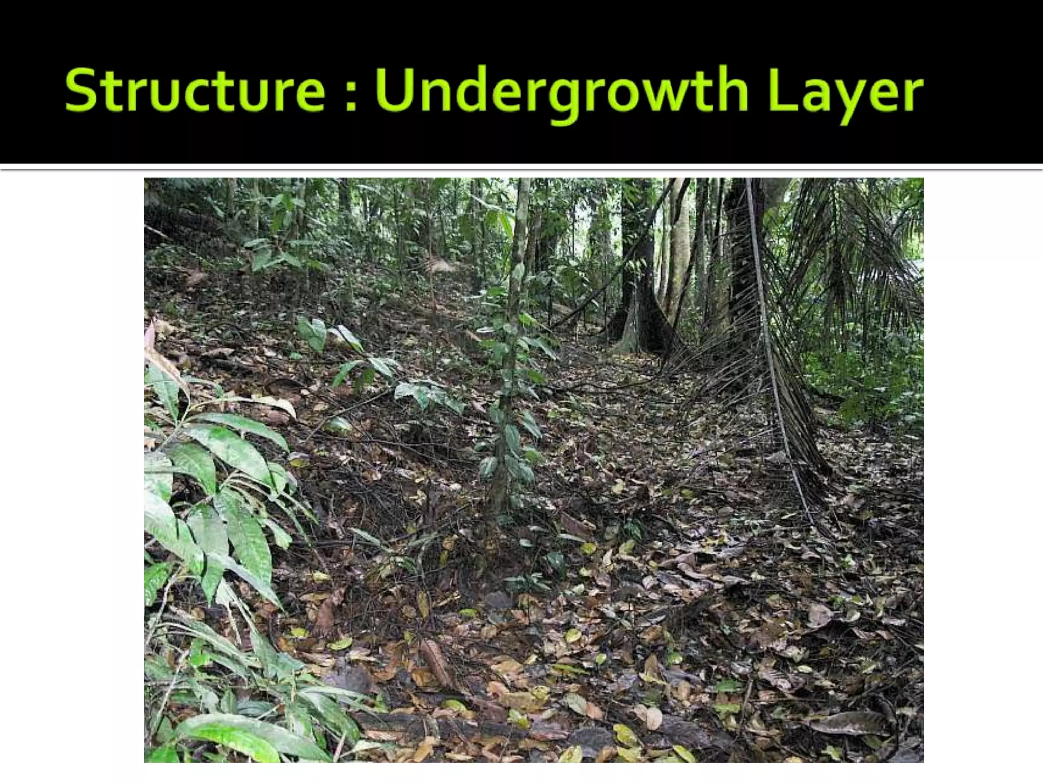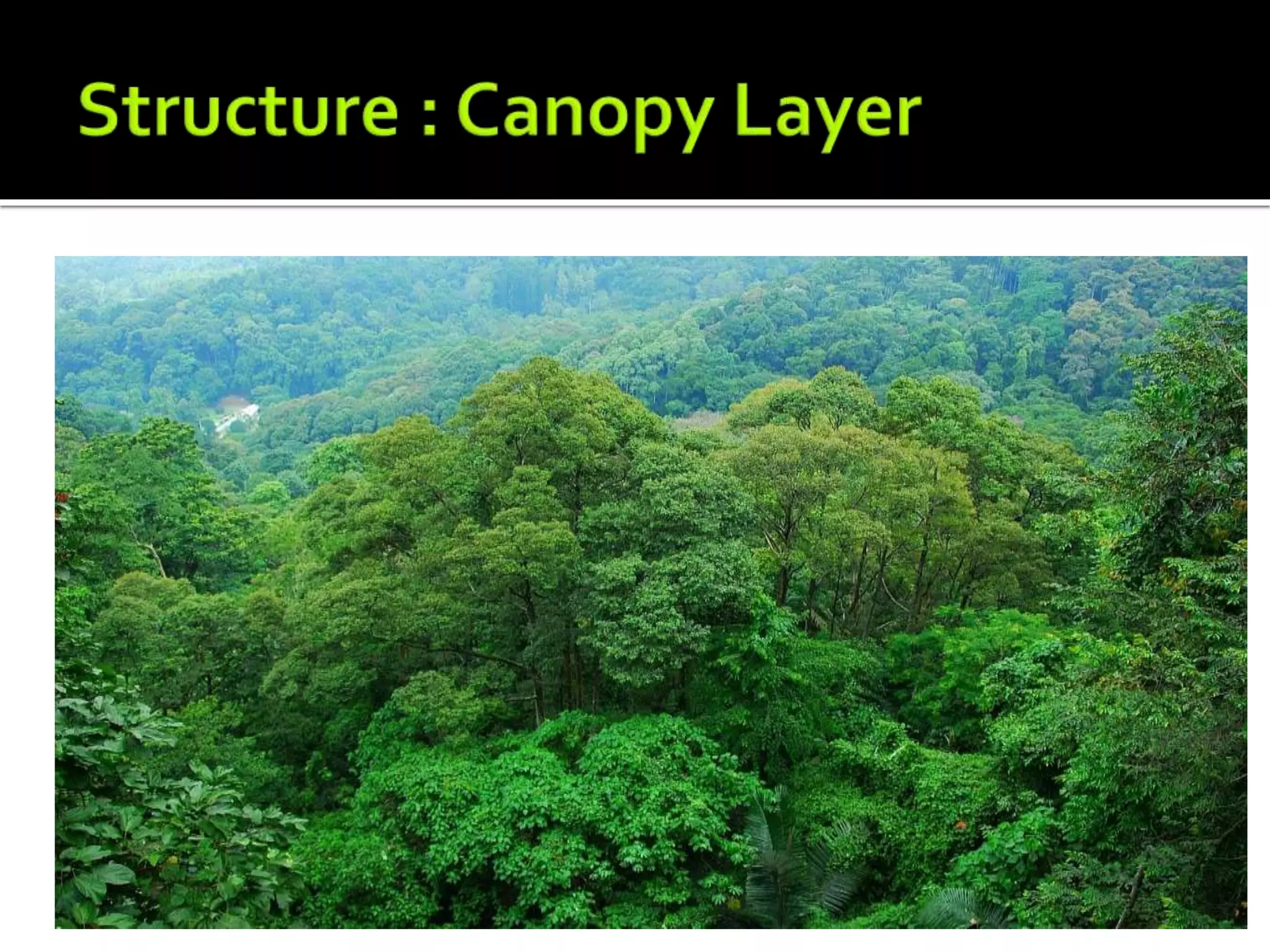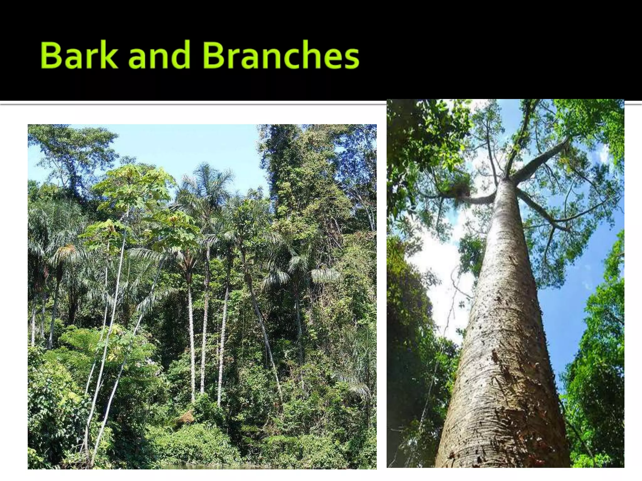 The document describes the three-layer structure of rainforests, which consists of an emergent layer with the tallest trees up to 50-80m, a canopy layer of trees 20-30m tall that block 90% of sunlight, and an undergrowth layer of shorter trees under 20m. Rainforest plants have adaptations like tall trunks to maximize sunlight exposure, waxy leaves to reduce water loss, and buttress roots to support heavy trunks in the wet climate. Lianas and epiphytes also grow in the canopy using trees for structure and sunlight.