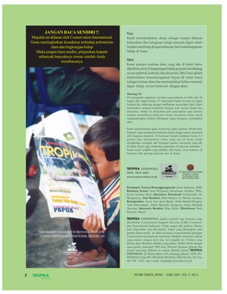 Majalah Tropika Indonesia edisi musim panen 2008 mengedepankan isu pelestarian keanekaragaman hayati dan konservasi lingkungan, dengan fokus pada peran masyarakat lokal dalam menjaga warisan alam. Organisasi Conservation International Indonesia berkomitmen untuk melibatkan masyarakat dalam upaya konservasi, termasuk pelestarian penyu, pendidikan ekosistem laut, dan penyadaran akan pentingnya lingkungan. Melalui artikel-artikel dan kegiatan yang dilaporkan, majalah ini berupaya meningkatkan kesadaran akan perlunya menjaga keseimbangan antara manusia dan alam demi keberlangsungan generasi mendatang.