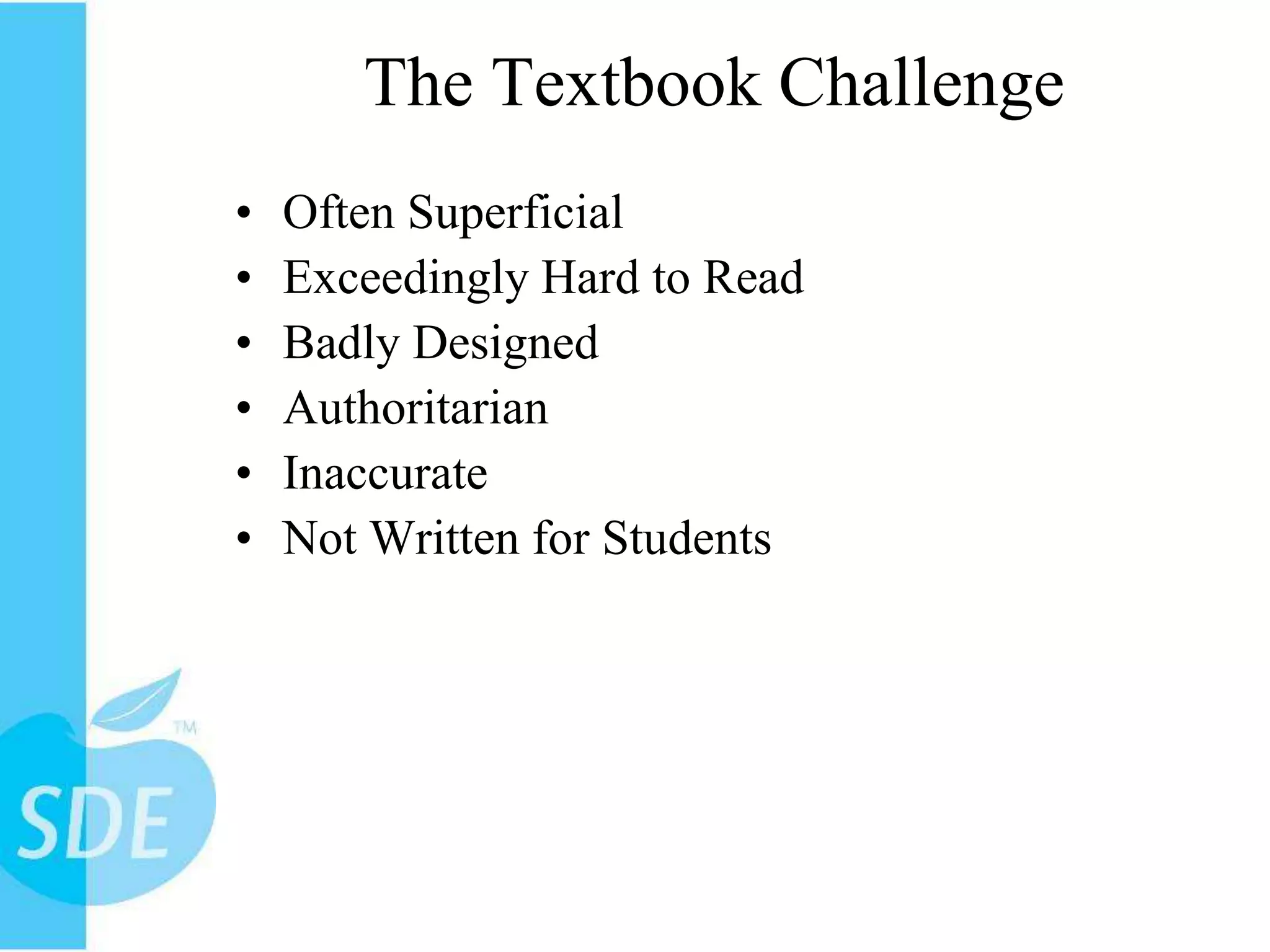 The document discusses the challenges of using textbooks in the classroom. Textbooks are often difficult for students to read due to superficial content, authoritarian tone, and poor design. The author provides six strategies for using textbooks more effectively: having empathy for students' struggles, front-loading instruction, not leaving students alone with textbooks, being selective in assignments, supplementing textbooks richly, and analyzing textbook features. The document concludes by encouraging teachers to consider the role of textbooks in teaching and how to promote critical thinking through textbook use.