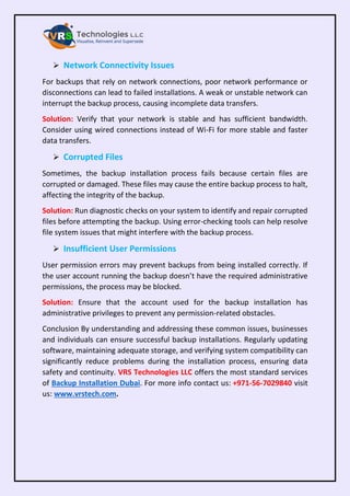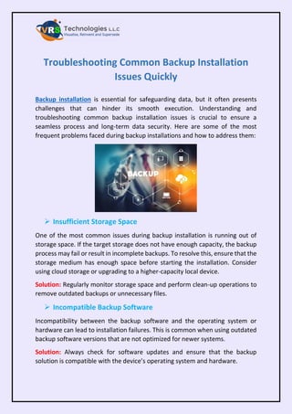 In this PDF, we discuss about the how to troubleshoot common backup issues quickly. VRS Technologies LLC offers the strong supplier of Backup Installation Dubai. For more info contact us: +971-56-7029840 visit us: https://www.vrstech.com/backup-and-recovery-solutions-dubai.html