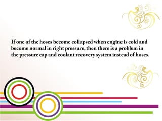 Engine coolant is essential for regulating engine temperature and preventing overheating. Common issues include checking for leaks under the hood, inspecting hoses for damage, and ensuring the pressure cap is functional. If leaks are suspected, particularly from the water pump, a service visit for a pressure test is advised.
