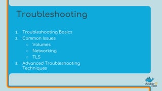 The document discusses various troubleshooting techniques for Docker including using tools like socat and curl to characterize networking and TLS issues, checking container processes and permissions, using volumes to store persistent data, and resolving issues with incorrect localhost references between containers. It also provides examples of troubleshooting issues with a Minecraft server, Ruby application, and Nginx proxy configuration.
