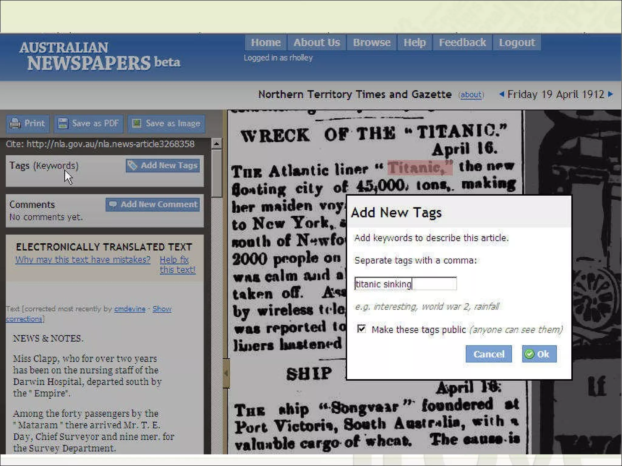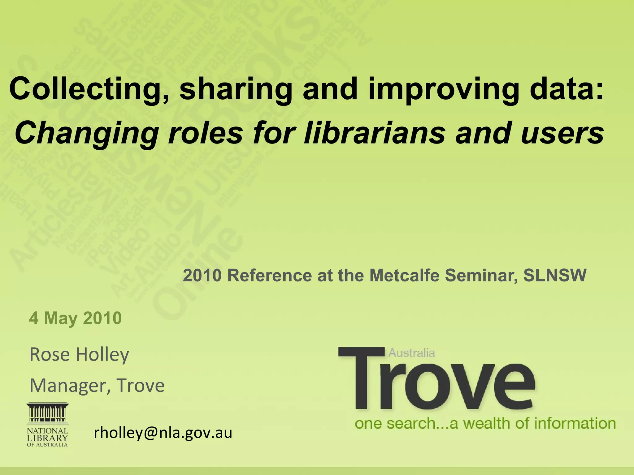 The document discusses the changing roles of librarians and users in the digital age. It describes how cultural institutions are digitizing collections and engaging users to collaboratively enhance information through features like tagging and correcting text. Initiatives like the National Library of Australia's Australian Newspapers project allow millions of articles to be searched and improved online through crowdsourcing.