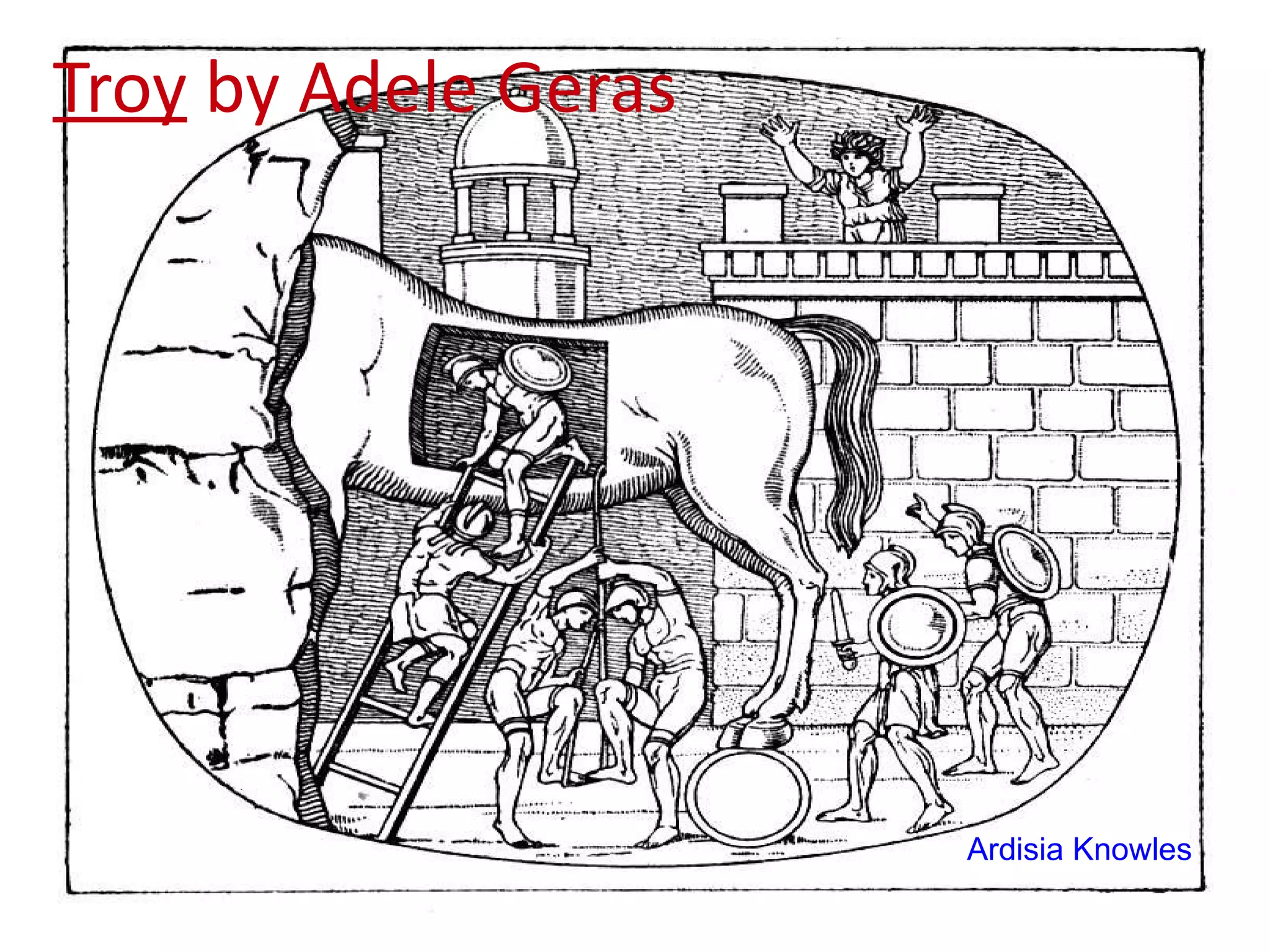 The document discusses the novel Troy by Adele Geras and how it incorporates themes from Greek mythology. Some of the major themes in Troy that connect to mythology are love and desire, and trickery by the gods. The theme of love and desire explores the difference between true love and simple desire, as seen in myths and works like A Midsummer Night's Dream. The gods in Troy, particularly Aphrodite, use trickery and meddling to influence mortal affairs, reflecting how gods saw mortals as playthings in myths. Learning about these mythological themes helps the reader better understand future works of literature that reference mythology.