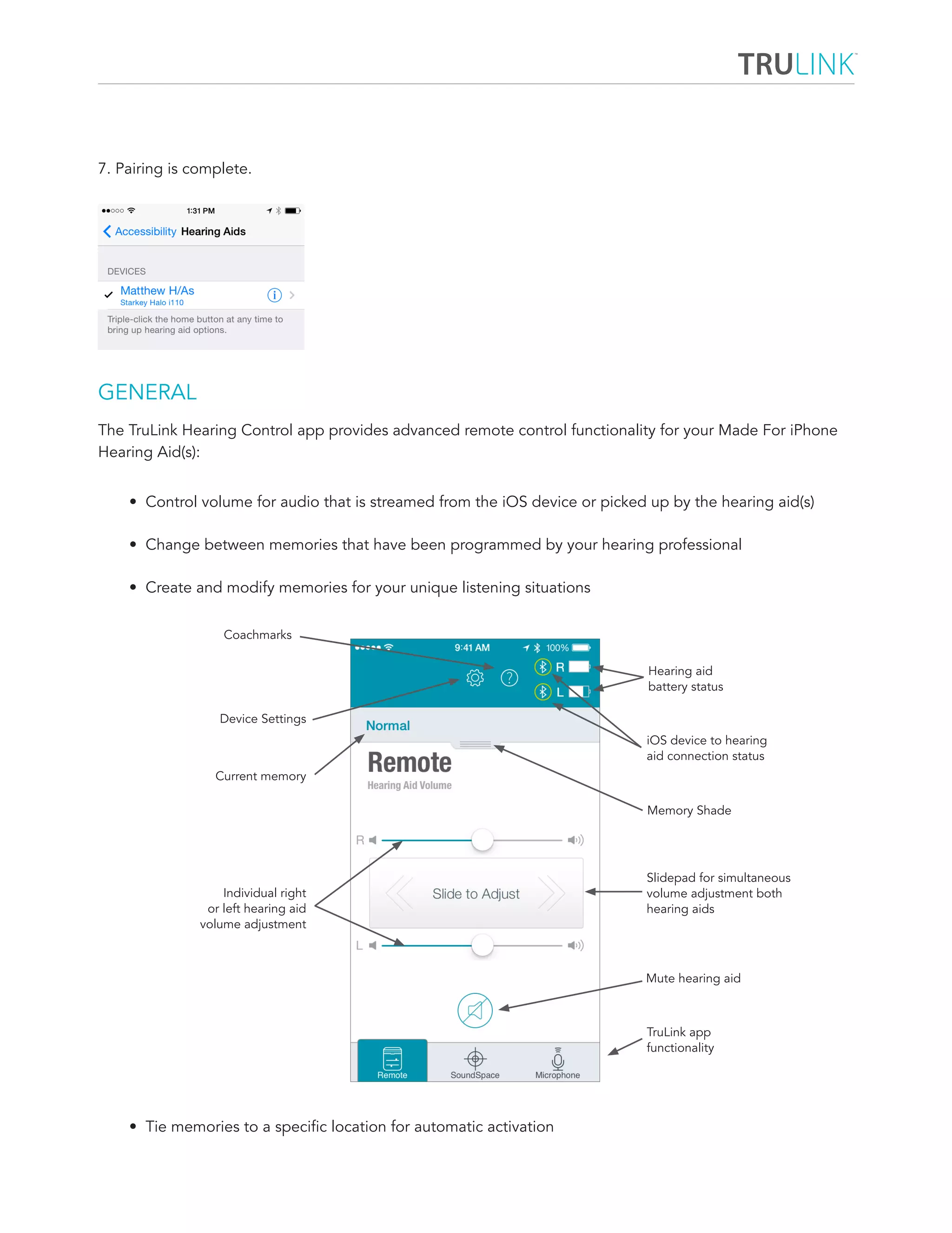 1. The document provides instructions for pairing Made for iPhone hearing aids with an iOS device using the TruLink Hearing Control app.