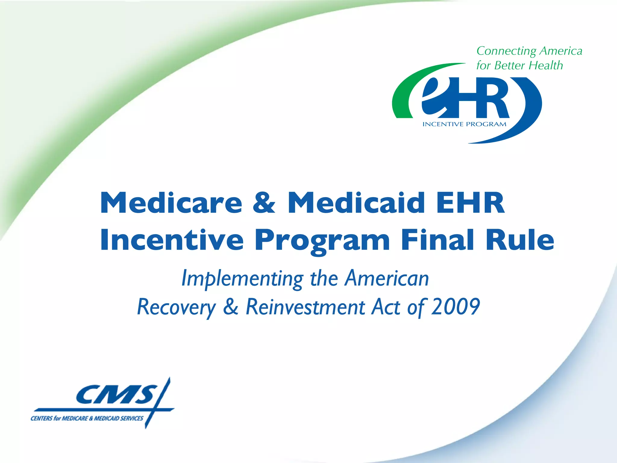 This document summarizes changes from the proposed rule to the final rule for Stage 1 of the Medicare and Medicaid EHR Incentive Program's meaningful use criteria. Key changes included lowering thresholds for some objectives, removing administrative transactions, adding new objectives, and modifying clinical quality measures for eligible professionals. The final rule provided more flexibility for states and clarified various eligibility and reporting requirements.