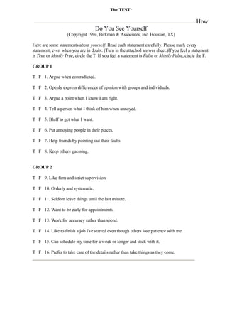 The document is a personality test called the "True Colors" test. It contains 16 statements about oneself divided into two groups, with respondents indicating whether each statement is true or false of themselves. After answering all questions, respondents are instructed to tally their true answers for each group and check their scores against a scale to determine their personality "color" or quadrant.