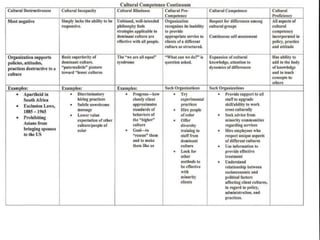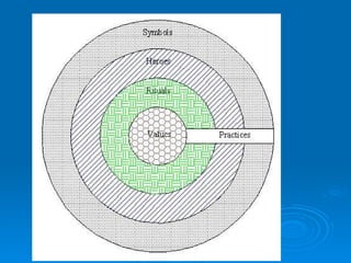 This document discusses cultural competence and diversity. It provides definitions of culture, cultural determinism, ethnocentrism, and cultural relativity. It describes how culture manifests itself through symbols, heroes, rituals, and values. The document also discusses developing culturally competent health promotion programs by understanding an individual's worldview, assessing one's own organization, and utilizing the National CLAS Standards. The overall purpose is to facilitate understanding of cultural diversity.