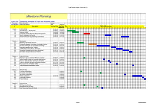 This document contains a timeline and milestone plan for a PhD project titled "True Colours Project Tools ENG". The plan outlines 46 milestones across 5 tracks: literature, research, publications, reporting, and education. Track 1 involves literature review milestones spanning 2012-2015. Track 2 lists research milestones from 2013-2016 related to modeling, analysis, decision techniques, and tool development. Track 3 outlines 6 publication milestones from 2013-2016. Track 4 includes presentation and thesis submission milestones from 2013-2016. Track 5 involves attending 3 educational events from 2013-2014.