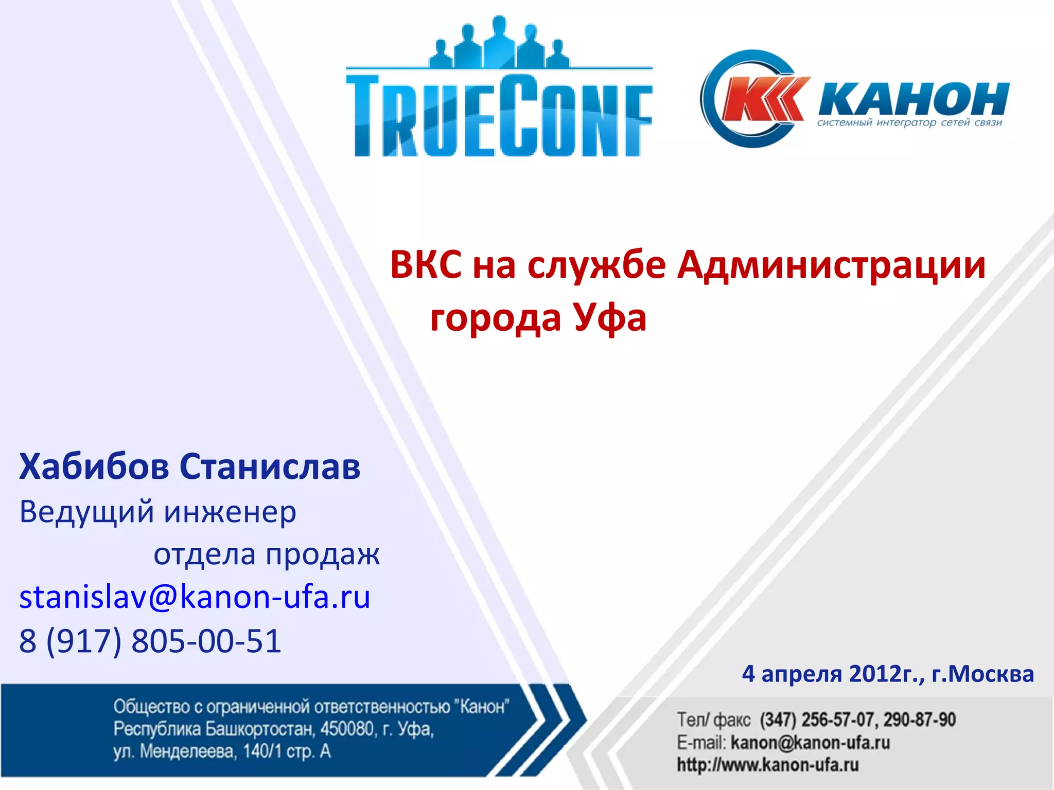 Документ описывает внедрение видеоконференцсвязи (ВКС) в администрации города Уфа для улучшения оперативного управления и координации лечебных учреждений. Основными преимуществами выбора системы TrueConf стали легкость развертывания и высокая техническая поддержка. В результате, количество пользователей ВКС выросло до 500, что позволяет проводить регулярные совещания и дистанционное образование.
