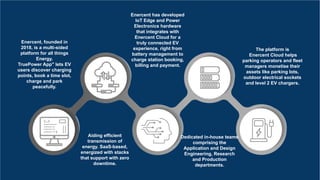 Enercent, established in 2018, provides a comprehensive IoT-based energy platform for electric vehicle (EV) users, enabling real-time charging management, asset monetization for parking operators, and integrated billing services. Their TruePower app allows users to locate charging stations, book slots, and manage charging sessions, while the company also offers various EV charging solutions tailored for residential, commercial, and fleet use. With a focus on zero downtime SaaS solutions and significant technological infrastructure, Enercent supports a vast network of partners and connected vehicles across India.