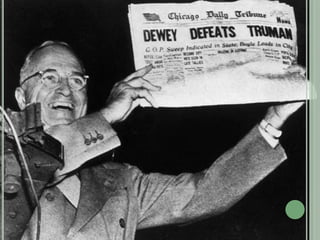 Harry S. Truman was the 33rd president of the United States. He took office in 1945 after Franklin Roosevelt died. As president, Truman faced major decisions including dropping the atomic bombs on Japan to end WWII, starting NATO and the Marshall Plan to rebuild Europe, and fighting communism through policies like the Truman Doctrine. He won an unlikely reelection victory in 1948. During his second term, Truman sent troops to Korea and fired General MacArthur, faced accusations of communism from Senator McCarthy, and oversaw the rebuilding of the White House. After leaving office in 1953, Truman worked to establish his presidential library and later died in 1972.