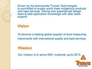 Trumen Technologies Pvt. Ltd. is an ISO 9001:2008 certified company that supplies level sensing instruments. Their vision is to become a leading global supplier of level measuring instruments with international quality and best services. Their mission is to serve over 500 customers by 2013. They produce several types of level switches for solids and liquids that are compact, require low power, and have customized process connections. These include vibrating fork, capacitance, RF admittance, and conductivity switches.