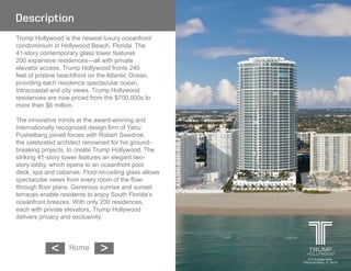 Trump Hollywood is a new 41-story luxury oceanfront condominium tower in Hollywood Beach, Florida. It has 200 luxury residences with private elevator access, 240 feet of beachfront, and spectacular ocean and city views. Residences range from 2,100 to 9,000 square feet and are priced from $700,000 to over $6 million. Amenities include an oceanfront pool and cabanas, fitness center, spa, movie theater, and wine cellar. The building is located in Hollywood Beach near shopping, dining, and beaches.